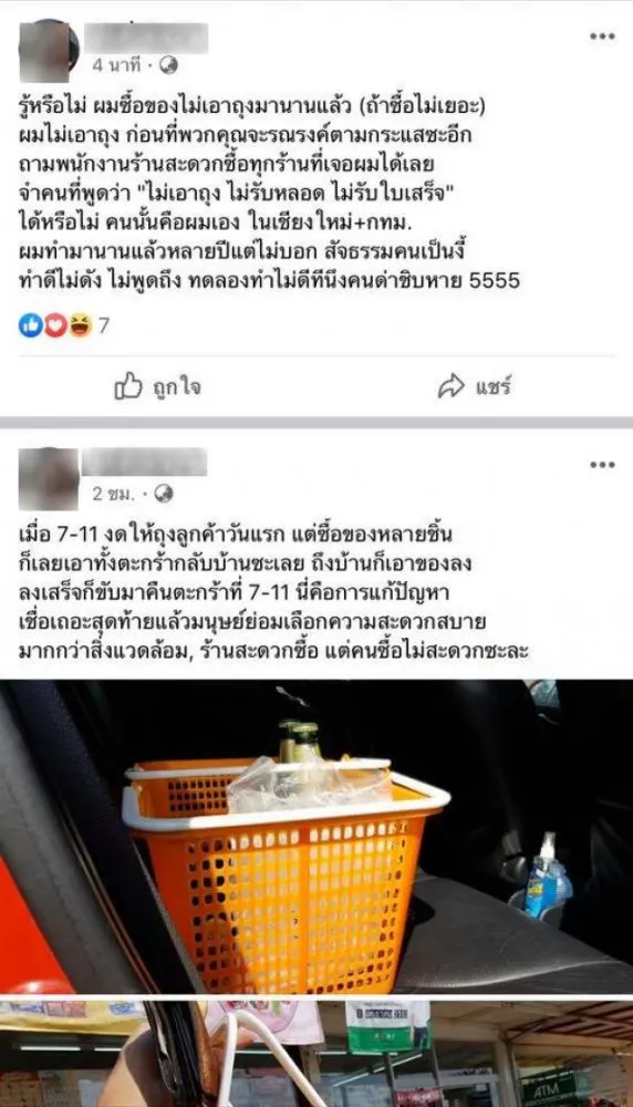ผู้ใช้เฟซบุ๊กโพสต์ข้อความระบุว่า ผมอยากถูกด่าเพื่อความเป็นสิริมงคลในปีใหม่ครับ เมื่อ 7-11 งดให้ถุงลูกค้าวันแรก แต่ซื้อของหลายชิ้น ก็เลยเอาทั้งตะกร้ากลับบ้านซะเลย ถึงบ้านก็เอาของลง ลงเสร็จก็ขับมาคืนตะกร้าที่ 7-11 นี่คือการแก้ปัญหา เชื่อเถอะสุดท้ายแล้วมนุษย์ย่อมเลือกความสะดวกสบายมากกว่าสิ่งแวดล้อม ร้านสะดวกซื้อ แต่คนซื้อไม่สะดวกซะละ
