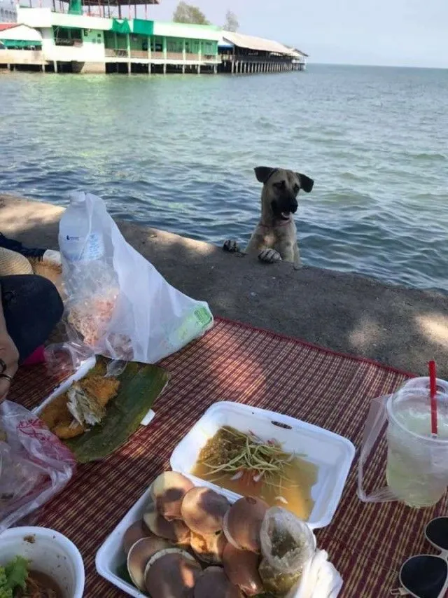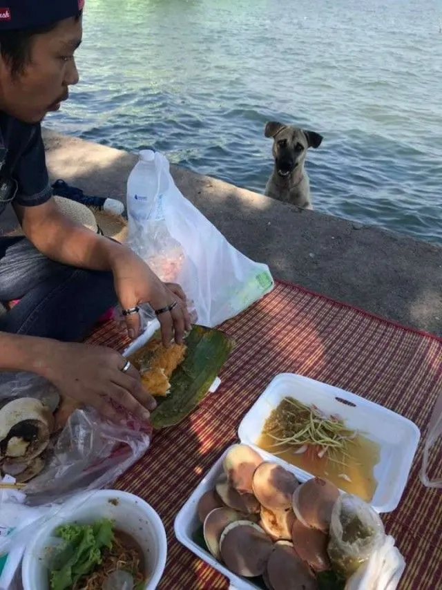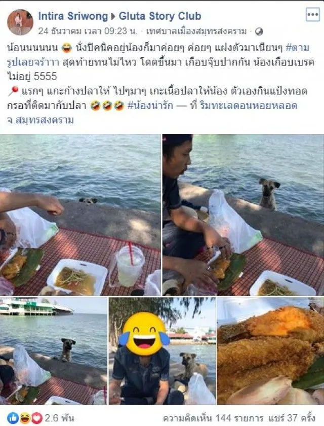 โดยผู้ใช้เฟซบุ๊ก Intira Sriwong ได้โพสต์ว่า น้องนั่งปิคนิคอยู่น้องก็มาค่อยๆ ค่อยๆ แฝงตัวมาเนียนๆ ตามรูปเลยจร้าาา สุดท้ายทนไม่ไหว โดดขึ้นมา เกือบจุ๊บปากกัน น้องเกือบเบรคไม่อยู่ 5555แรกๆ แกะก้างปลาให้ ไปๆมาๆ แกะเนื้อปลาให้น้อง ตัวเองกินแป้งทอดกรอที่ติดมากับปลา น้องน่ารัก อยู่ที่ ริมทะเลดอนหอยหลอด จังหวัดสมุทรสงคราม