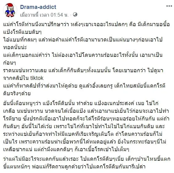 จากกรณีที่เด็กวัยรุ่นไทย พากันถ่ายคลิปลงในโลกออนไลน์ ถึงการรับประทานแป้งโรตีดิบ ซึ่งทางด้านเพจเฟซบุ๊ก Drama-addict ได้ออกมาโพสต์ เตือนภัยผู้ปกครองและเด็กๆ โดยมีข้อความระบุว่า.. แม่ค้าโรตีท่านนึงมาปรึกษาว่า หลังๆเขาเจออะไรแปลกๆ คือ มีเด็กมาขอซื้อแป้งโรตีแบบดิบๆ ไอ้แบบที่กลมๆ แล้วพ่อค้าแม่ค้าโรตีเอามานวดเป็นแผ่นบางๆก่อนเอาไปทอดนั่นน่ะ แต่เด็กๆบอกแม่ค้าว่า ไม่ต้องเอาไปโดนความร้อนอะไรทั้งนั้น เอามาเป็นก้อนๆ ราดนมข้นหวานเลย แล้วเด็กก็กินดิบๆทั้งแบบนั้น โดยเขาบอกว่า ไปดูมาจากคลิปใน tiktok