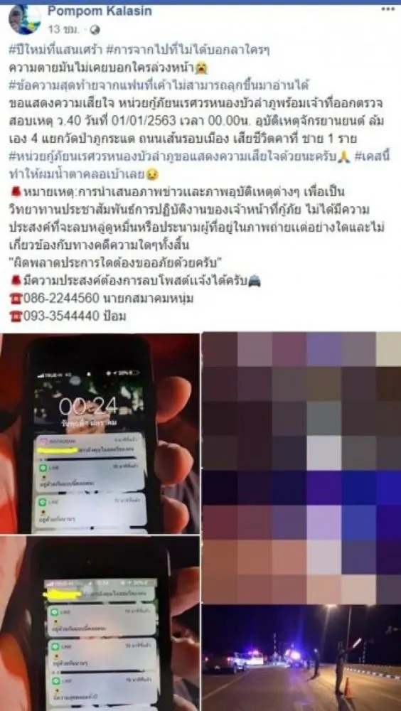 กลายเป็นโพสต์ที่สุดเศร้า ที่ทำเอาคนที่พบเห็นและชาวโซเชียลต่างก็ต้องน้ำตาซึมไปตามๆกัน เมื่อผู้ใช้เฟซบุ๊คชื่อ Pompom Kalasin ซึ่งเป็นเจ้าหน้าที่กู้ภัยนเรศวรหนองบัวลำภู ได้โพสต์เรื่องราวการเกิดเหตุบนท้องถนนที่ทำเอาน้ำตาซึม โดยระบุว่า ปีใหม่ที่แสนเศร้า การจากไปที่ไม่ได้บอกลาใคร ๆ ข้อความสุดท้ายจากแฟนที่เค้าไม่สามารถลุกขึ้นมาอ่านได้