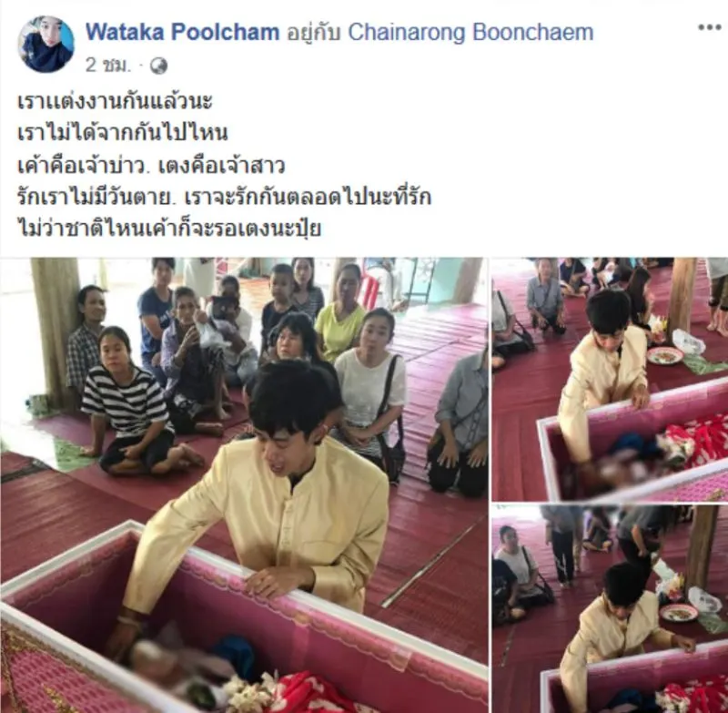 กระทั่งล่าสุด แฟนหนุ่มได้โพสต์ภาพงานวิวาห์สุดเศร้า ที่ทำให้ใครหลายคนต้องน้ำตาไหล เพราะเขาได้จัดงานวิวาห์กับเธอ ในขณะที่ร่างของเธออยู่ในโลงศพ พร้อมกับระบุข้อความว่า