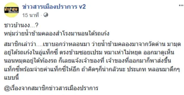เป็นเรื่องที่ทำให้ชาวบ้านตื่นกลัวมากสำหรับหนุ่มรายนี้อยู่ๆก็ไหว้น้ำมานอนใต้ท้องรถเก๋ง เมื่อวันที่ 2 มกราคม เพจ ข่าวสารเมืองปราการ v2 ได้โพสต์ข้อความระบุว่า ชาวบ้านงง หนุ่มว่ายน้ำข้ามคลองสำโรงมานอนใต้รถเก๋ง สมาชิกเล่าว่า เขาบอกว่าหลอนมา ว่ายน้ำข้ามคลองมาจากวัดด่าน มามุดอยู่ใต้รถเก๋งในอู่แท็กซี่ ตรงข้ามซอยเปรม หมาเห่าไม่หยุด ออกมาดูเห็นนอนหมุดอยู่ใต้ท้องรถ ก็เลยแจ้งเจ้าของที่ เจ้าของที่ออกมาก็พาส่งขึ้นแท็กซี่พร้อมจ่ายค่าแท็กซี่ให้อีก ถ้าคิดๆก็น่ากลัวนะ ประเภท หลอนมาดึกๆแบบนี้ เรื่องจากสมาชิกข่าวสารเมืองปราการ ในภาพอาจจะมี หนึ่งคนขึ้นไป และ ผู้คนกำลังยืน