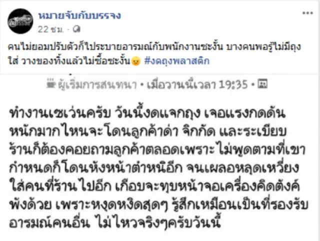 ล่าสุดก็ได้มีพนักงานเซเว่นมาเปิดใจผ่านโซเชียลถึงเรื่องการงดใช้ถุงวันแรก พึ่งผู้ที่นำเรื่องราวมาเผยแพร่คือเพจเฟซบุ๊ก หมายจับกับบรรจง ได้เผยข้อความจากพนักงานร้านสะดวกซื้อ ได้ระบายความรู้สึก หลังมีปประกาศดังกล่าวว่า