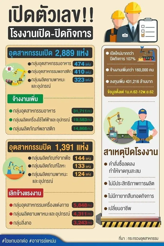 เพจเฟซบุ๊ก ไทยคู่ฟ้า โพสต์ข้อความพร้อมภาพประกอบการว่า กระทรวงอุตสาหกรรมเปิดเผยตัวเลขโรงงานเปิดกิจการและปิดกิจการตั้งแต่วันที่ 1 ม.ค. – 12 พ.ย. 62 พบว่ามีการยื่นขอปิดโรงงาน 1,391 โรงงานจากสาเหตุเพราะขาดทุนสะสมไม่คุ้มกับการดำเนินกิจการ เครื่องจักรที่มีสภาพไม่พร้อม ล้าสมัย ไม่มีประสิทธิภาพในการผลิต ไม่มีทายาทสืบทอดรวมถึงผู้ประกอบกิจการเปลี่ยนอาชีพ ส่วนการยื่นขอเปิดกิจการโรงงานอีกกว่า 2,800 โรงงาน ซึ่งทำให้มีการลงทุนเพิ่มในกิจการโรงงานถึง 431,216 ล้านบาท สูงกว่าปี 2561 ถึง 36.6% แสดงให้เห็นว่าการดำเนินกิจการโรงงานปัจจุบันไม่ได้อยู่ในสภาพถดถอย