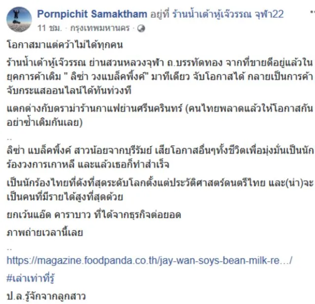 โอกาสมาแต่คว้าไม่ได้ทุกคน ร้านน้ำเต้าหู้เจ๊วรรณ ย่านสวนหลวงจุฬา ถ.บรรทัดทอง จากที่ขายดีอยู่แล้วในยุคการค้าเดิม ลิซ่า วงแบล็คพิ้งค์ มาทีเดียว จับโอกาสได้ กลายเป็นการค้าจับกระแสออนไลน์ได้ทันท่วงที แตกต่างกับร้านกาแฟแถวศรีนครินทร์ (คนไทยพลาดแล้วให้โอกาสกัน อย่าซ้ำเติมกันเลย) ลิซ่า แบล็คพิ้งค์ สาวน้อยจากบุรีรัมย์ เสียโอกาสอื่นๆทั้งชีวิตเพื่อมุ่งมั่นเป็นนักร้องวงการเกาหลี และแล้วเธอก็ทำสำเร็จ เป็นนักร้องไทยที่ดังที่สุดระดับโลกตั้งแต่ประวัติศาสตร์ดนตรีไทย และ(น่า)จะเป็นคนที่มีรายได้สูงที่สุดด้วย
