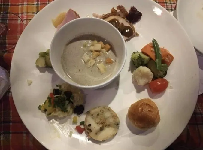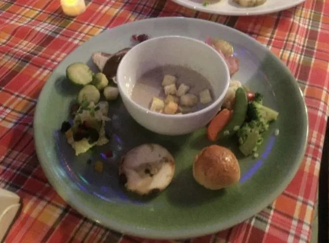 สิ่งที่ปรากฏตรงหน้าเพียงอาหารอย่างละกระจุก วางรอบถ้วยซุปเห็นก้นถ้วย (เพราะพนักงานกว่าจะหั่นไก่ จัดจานเตรียมผักต้ม ราดซอส บลาๆ ขนมปังที่โรยบนซุปก็แฉะไปแล้ว ผักหนึ่งกระจุก มันฝรั่งอีกกระจุก แฮมสองชิ้น ไฮไลท์คือไก่งวง มาเป็นขนาดเนยก้อนเล็ก 3 ชิ้น มีราดอะไรน้อยนิดจนสัมผัสรสชาติไม่ได้เลย นอกจากฝืดคอชุดนนี้สนนราคา 1000 บาทต่อชุดจร้าาาา