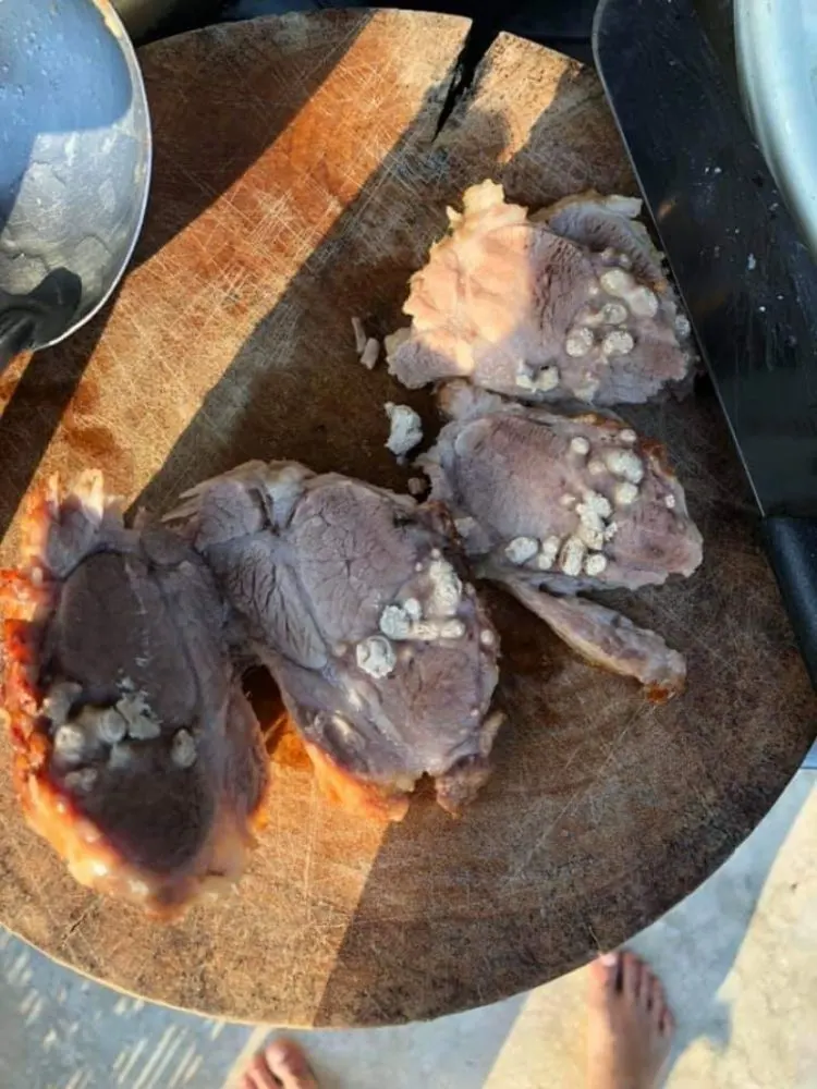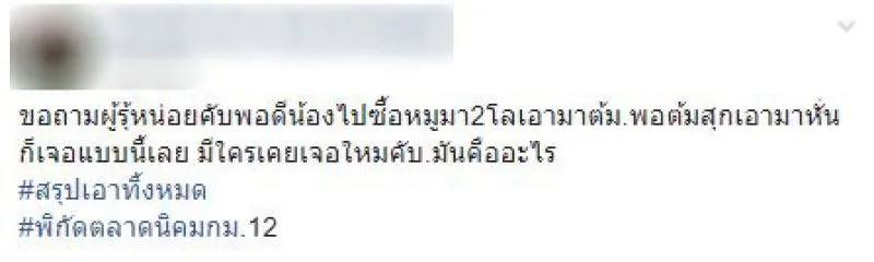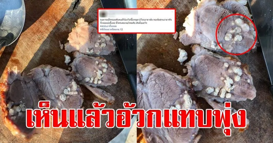 การเลือกซื้อสินค้าในตลาดจะต้องเลือกร้านค้าที่มีความสะอาด มีความสดใหม่เสมอ เพราะถ้าเลือกสินค้าที่ไม่มีคุณภาพอาจจะส่งผลต่อสุขภาพร่างกายของผู้บริโภค ล่าสุดได้มีผู้ใช้เฟซบุ๊กรายหนึ่งได้โพสต์ภาพและข้อความของการได้เลือกซื้อเนื้อหมูมาทำอาหารจากตลาดแห่งหนึ่งในจังหวัดชลบุรี แต่เมื่อหั่นดูด้านในกลับพบสิ่งแปลกปลอมอยู่ด้านใน โดยมีข้อความระบุว่า ขอถามผู้รู้หน่อยครับ พอดีน้องไปซื้อหมูมา 2 กิโลเอามาต้ม พอต้มสุกเอามาหั่นก็เจอแบบนี้เลย มีใครเคยเจอใหมครับ มันคืออะไร