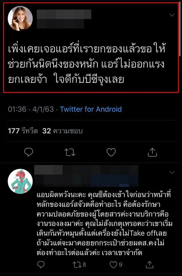 กลายเป็นประเด็นร้อนในโลกออนไลน์ เมื่อไอดอลคนดัง ได้ทวิตข้อความผ่านทางทวิตเตอร์ระบุว่า "เพิ่งเคยเจอแอร์ที่เรายกของแล้วขอให้ช่วยกันนิดนึงของหนัก แอร์ไม่ออกแรงยกเลยจ้า ใจดีกับบีซีจังเลย" เนื่องจากไม่พอใจที่พนักงานต้อนรับบนเครื่องบินที่ไม่ช่วยยกกระเป๋า จนทำให้เกิดกระแสวิพากษ์วิจารณ์กันอย่างหนัก เนื่องจากตามกฏแล้ว พนักงานต้อนรับบนเครื่องบินมีสิทธิ์ไม่ยกสัมภาระเก็บให้ผู้โดยสารได้