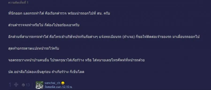 โดยจากเรื่องนี้ก็มีชาวเน็ตหลายท่านเข้ามาแสดงความคิดเห็น พร้อมกับให้คำแนะนำกันอย่างมากมาย ซึ่งทางที่ดีควรบอกให้เจ้าของรถรู้ตัว ว่าสร้างความเดือดร้อนให้กับคนอื่นอย่างมาก
