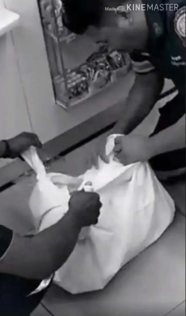 หลังจากนั้นพวกเขาเหล่านี้ก็ได้คลี่ผ้าออกมา ก่อนจะนำมาห่อของ ซึ่งเป็นผ้าขาวบาง หรือผ้าดิบนั้นเอง งานนี้ทำเอาเหล่าพนักงานและลูกค้าต่างตกใจกันเลยทีเดียว