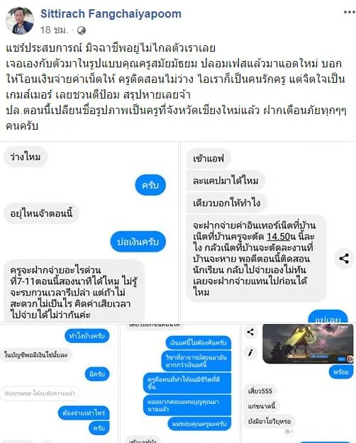 โดยผู้ใช้เฟซบุ๊กท่านนี้ระบุว่า…”แชร์ประสบการณ์ มิจฉาชีพอยู่ไม่ไกลตัวเราเลยเจอเองกับตัวมาในรูปแบบคุณครูสมัยมัธยม ปลอมเฟสแล้วมาแอดใหม่ บอกให้โอนเงินจ่ายค่าเน็ตให้ ครูติดสอนไม่ว่าง ไอ้เราก็เป็นคนรักครู แต่จิตใจเป็นเกมส์เมอร์ เลยชวนตีป้อม สรุปหายเลยจ้าปล.ตอนนี้เปลียนชื่อรูปภาพเป็นครูที่จังหวัดเชียงใหม่แล้ว ฝากเตือนภัยทุกๆๆคนครับ”