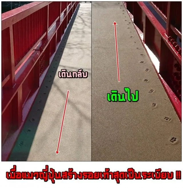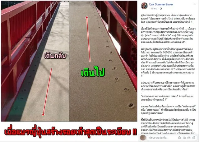 กลายเป้นอีกเรื่องราวที่ทำเอาบรรดาคนรักแมว ผู้ที่พบเห็นและชาวโซเชียลต่างก็ต้องอมยิ้มไปตามๆกัน เมื่อได้มีเพจเฟซบุ๊ค Eak SummerSnow ได้โพสต์ภาพพื้นสะพานที่ญี่ปุ่น ซึ่งที่พื้นมีรอยแมวเดินข้ามในณะที่พื้นปูนยังไม่แห้ง จึงเกิดเป็นรอยเท้าแมว และที่น่ารักไปกว่านั้นคือ แมวตัวนี้ได้เดินผ่านทั้งไปและกลับ โดยจะชิดริมขวาตลอด ซึ่งผู้ใช้เฟซบุ๊ค Eak SummerSnow ได้โพสต์ภาพและข้อความใจความว่า