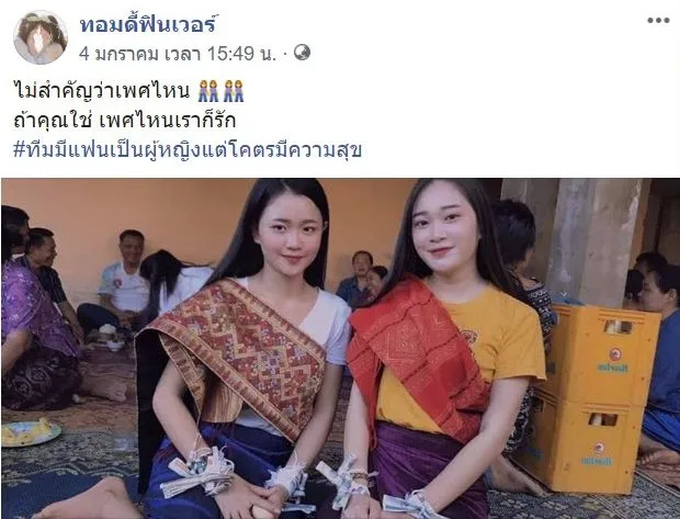 ทางเพจ ทอมดี้ฟินเวอร์ ได้ออกมาโพสต์ภาพ งานแต่งงานระหว่างผู้หญิงกับผู้หญิง โดยจากโพสต์นั้นได้ระบุว่า ไม่สำคัญว่าเพศไหน ถ้าคุณใช่ เพศไหนเราก็รัก #ทีมมีแฟนเป็นผู้หญิงแต่โคตรมีความสุข