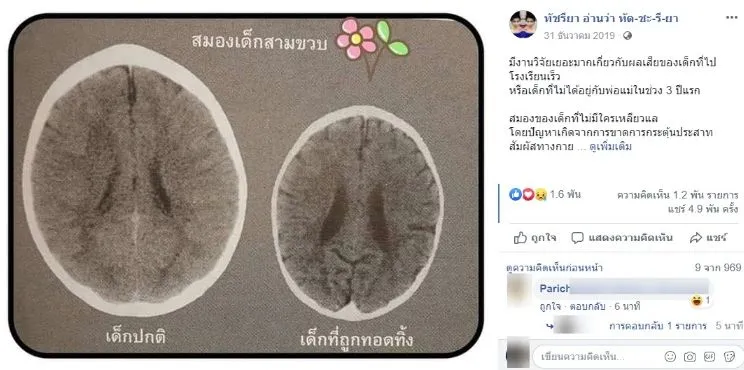 พร้อมข้อความระบุว่า “มีงานวิจัยเยอะมากเกี่ยวกับผลเสียของเด็กที่ไปโรงเรียนเร็ว หรือเด็กที่ไม่ได้อยู่กับพ่อแม่ในช่วง 3 ปีแรก สมองของเด็กที่ไม่มีใครเหลียวแล โดยปัญหาเกิดจากการขาดการกระตุ้นประสาทสัมผัสทางกาย เช่น การกอด การอุ้ม การพูดคุย เป็นต้น ซึ่งการกระตุ้นนี้จะไปสร้าง Sensory cue มันทำหน้าที่จัดระบบพื้นที่สำคัญๆในสมอง ดังนั้นเด็กที่ไม่ได้รับการกระตุ้น”
