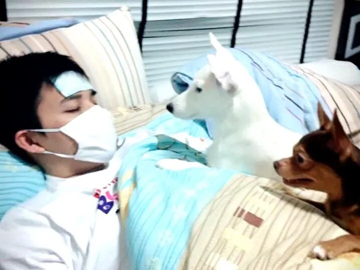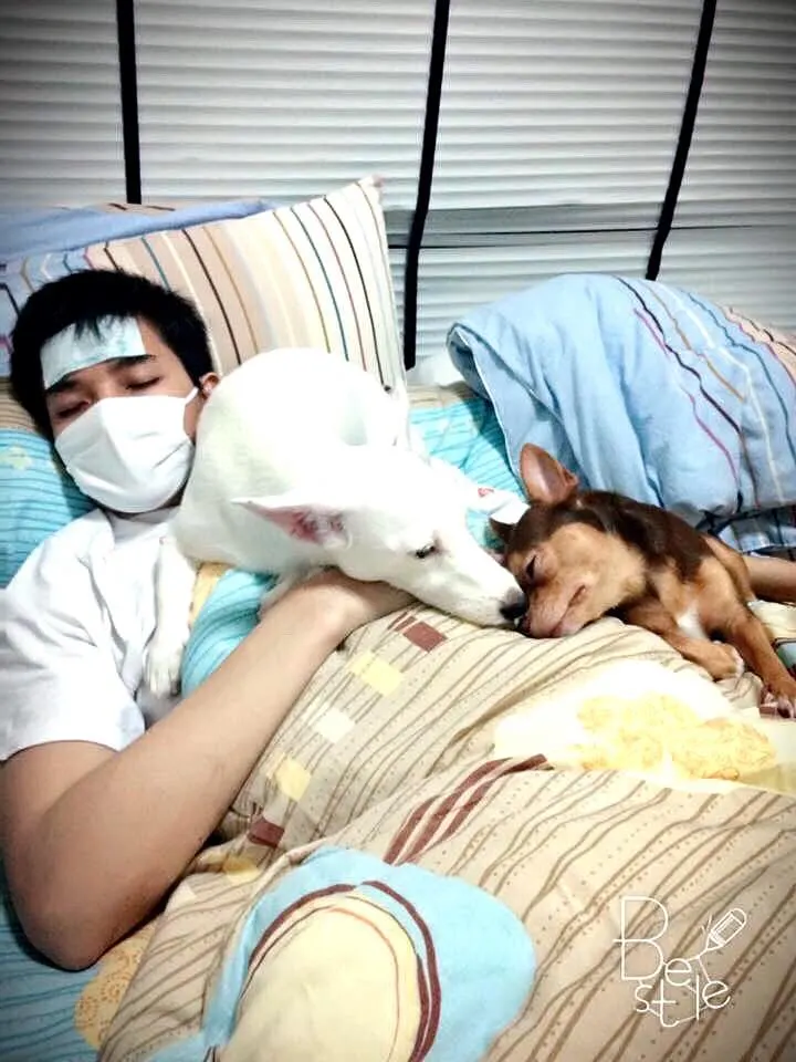 ทว่าสาเหตุที่แท้จริงเป็นเพราะความห่วงใยจากเจ้าตูบสุดที่รักทั้งสองของเขาที่พากันมานอนเฝ้าไม่ห่างนั่นเอง
