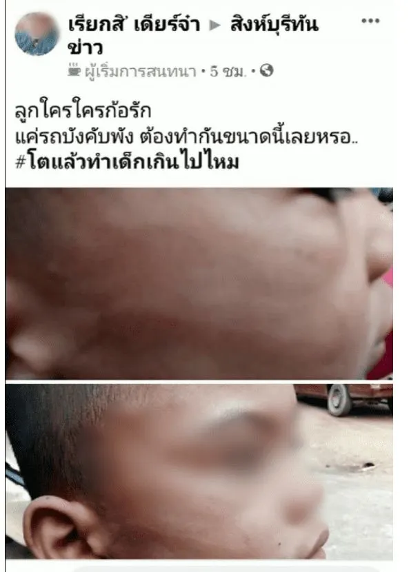 แต่เราก็ขอต่อรอง เขาไม่ยอมจะไปแจ้งความ ถ้าใครรู้จักเด็กคนนี้หรือครอบครัวนี้ก็จะรู้ว่าเป็นไง ทั้งนี้ ผู้โพสต์เรื่องดังกล่าว เล่าว่า ตนเป็นพี่สาวของเด็กชายที่โดนตบ น้องของตนชื่อ ดช เอ นามสมมุติ อายุ 6 ขวบ เรียนอยู่ชั้นอนุบาล 3 โดยเมื่อวันที่ 27 ธค เวลา ประมาณ 17 30 น ที่ผ่านมา ดช. เอไปขี่จักรยานเล่นกับเพื่อนๆ ที่สวนสาธารณะของอบต.จักรสีห์ และมี ดญ บี นามสมมุติ เล่นรถบังคับอยู่ใกล้ๆ