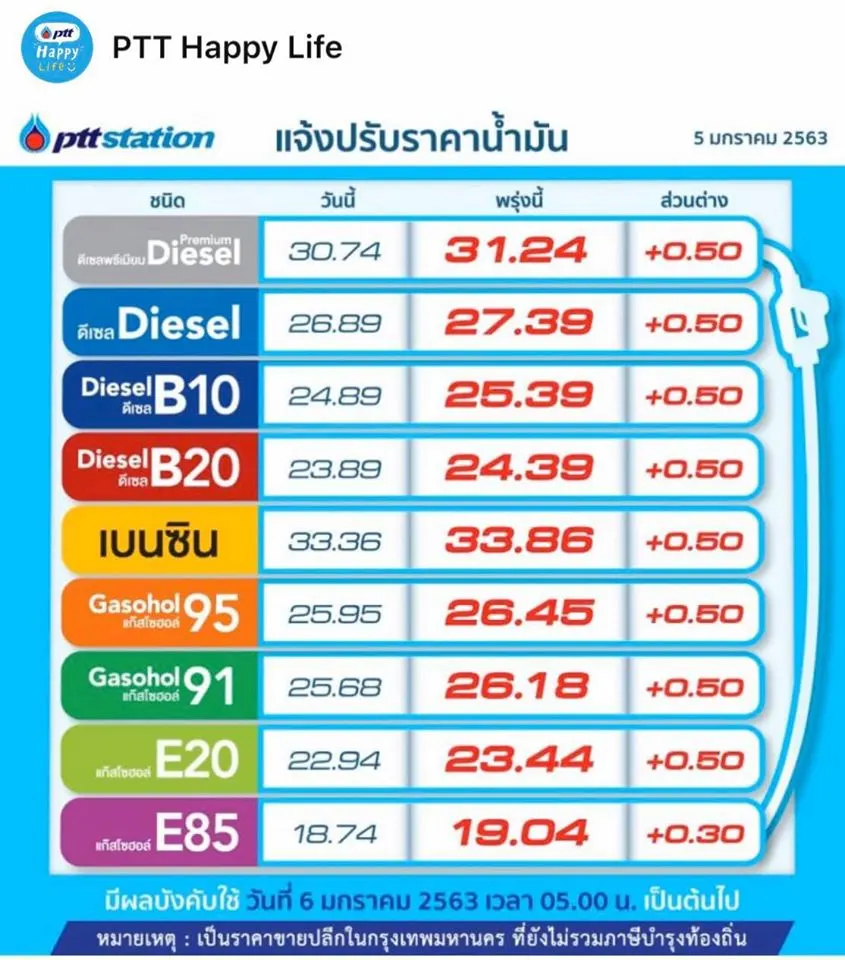 ข่าวประกาศว่าพรุ่งนี้ (6 ม.ค 2563) น้ำมันทุกชนิดขึ้นราคา 50 สต./ลิตร ยกเว้นอี85 ขึ้นราคา 30 สต./ลิตร ทั้งที่รัฐบาลประกาศให้ของขวัญปีใหม่ประชาชน ด้วยการลดราคาน้ำมันทุกชนิดลิตรละ 1บาท ตั้งแต่วันที่26ธ.ค 2562 - 10 ม.ค 2563 แต่กลับปล่อยให้โรงกลั่นรีบขึ้นราคาน้ำมันลิตรละ50สต. ตั้งแต่วันที่6 มกราคมเสียแล้วละหรือ !?