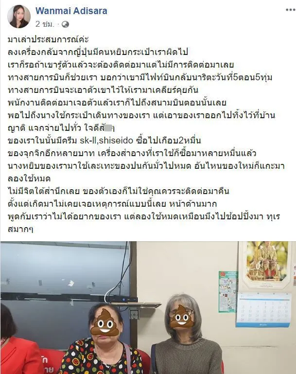 สาวเจ้าของเฟซบุ๊ก Wanmai Adisara แชร์ประสบการณ์เดือดหลังจากกระเป๋าของเธอถูกหยิบผิดไปจากสนามบินหลังบินกลับจากญี่ปุ่น ทางสายการบินเช็คดูก็ทราบว่าผู้โดยสารคนไหนที่เป็นคนเอาไปและได้นัดให้เธอมาเจอกับคู่กรณีในเที่ยวบินขากลับ สิ่งที่เห็นทำเอาโกรธจนหน้าชา