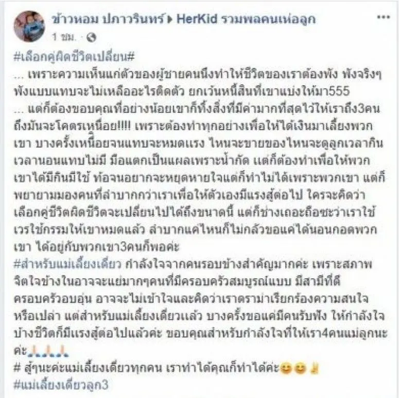 เป็นความจริงของสังคมในปัจุบัน กับความล้มเหลวและพังทลายลงของชีวิตคู่ ซิงเกิ้ลมัม หรือ แม่เลี้ยงเดี๋ยว เป็นคำที่เราฟังติดหูกันแล้ว โดยสมาชิกเฟซบุ๊ก ข้าวหอม ปภาวรินทร์ ได้โพสต์ผ่านกลุ่ม HerKid รวมพลคนเห่อลูก ซึ่งเธอเขียนบรรยายเรื่องราว ว่า จากความเห็นแก่ตัวของผู้ชายคนหนึ่งทำให้ชีวิตของเธอพังจนแทบไม่มีอะไรเหลือ และยังต้องดูแลลูกอีก 3 คน แต่ลูกทั้ง 3 คนกลายเป็นพลังทำให้เธอเดินต่อไปได้ และกลายเป็นกำลังใจให้ใครหลายๆ คน