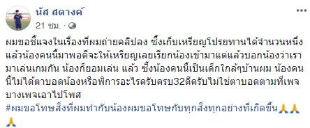 ล่าสุด เฟซบุ๊ก นัส สตางค์ โพสต์ข้อความระบุว่า ผมขอชี้แจงในเรื่องที่ผมถ่ายคลิปลง ซึ้งเก็บเหรียญโปรยทานได้จำนวนหนึ่งแล้วน้องคนนี้มาพอดีจะให้เหรียญเลยเรียกน้องเข้ามาแต่แล้วบอกน้องว่าเรามาเล่นเกมกัน น้องก็ยอมเล่น แล้ว ซึ้งน้องคนนี้เป็นเด็กใกล้ๆบ้านผม น้องคนนี้ไม่ได้ตาบอดน้องหรือพิการอะไรครับครบ32ดีครับไม่ใช่ตาบอดตามที่เพจบางเพจเอาไปโพส#ผมขอโทษสิ่งที่ผมทำกับน้องผมขอโทษกับทุกสิ่งทุกอย่างที่เกิดขึ้น