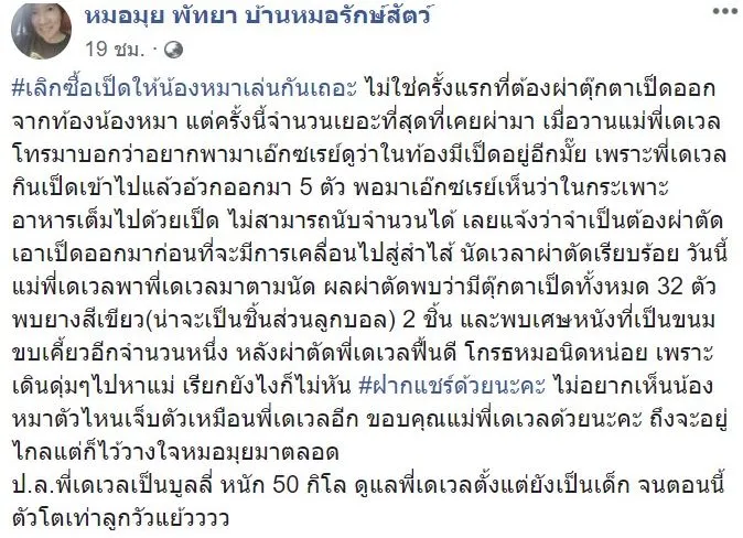 “เลิกซื้อเป็ดให้น้องหมาเล่นกันเถอะ ไม่ใช่ครั้งแรกที่ต้องผ่าตุ๊กตาเป็ดออกจากท้องน้องหมา แต่ครั้งนี้จำนวนเยอะที่สุดที่เคยผ่ามา เมื่อวานแม่พี่เดเวลโทรมาบอกว่าอยากพามาเอ๊กซเรย์ดูว่าในท้องมีเป็ดอยู่อีกมั๊ย เพราะพี่เดเวลกินเป็ดเข้าไปแล้วอ้วกออกมา 5 ตัว”