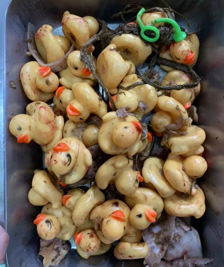 วันนี้แม่พี่เดเวลพาพี่เดเวลมาตามนัด ผลผ่าตัดพบว่ามีตุ๊กตาเป็ดทั้งหมด 32 ตัว พบยางสีเขียว(น่าจะเป็นชิ้นส่วนลูกบอล) 2 ชิ้น และพบเศษหนังที่เป็นขนมขบเคี้ยวอีกจำนวนหนึ่ง
