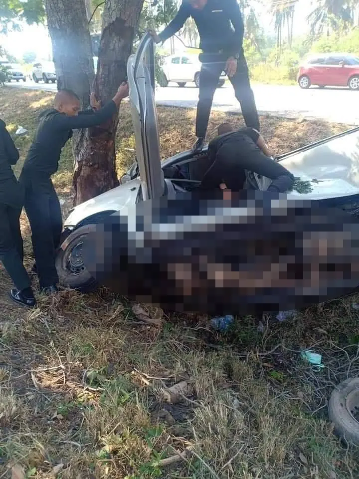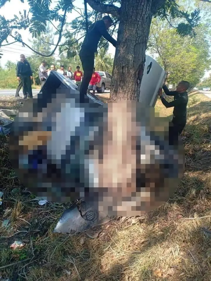 จุดเกิดเหตุ พบรถกระบะ ตกร่องกลางถนนชนอัดก็อปปี้กับต้นไม้ขนาดใหญ่ สภาพด้านหน้ารถพังยับเยินสัมภาระกระจัดกระจายเกลื่อนถนน