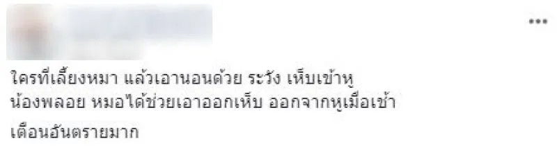 การเลี้ยงสุนัขภายในบ้านต้องดูแลอย่างใกล้ชิดและใสใจรายละเอียดเป็นพิเศษเพราะถ้าสุนัขมีสุขภาพไม่แข็งแรงอาจจะส่งผลต่อผู้เลี้ยงได้ เมื่อไม่นานมานี้ได้มีผู้ใช้เฟซบุ๊กรายหนึ่งได้โพสต์ภาพและข้อความของการเลี้ยงสุนัขไว้ภายในบ้านและได้เจอเห็บจากสุนัขเข้าไปในหูของบุตรสาว แต่ยังดีที่นำบุตรสาวไปโรงพยาบาลไว้ได้ทัน โดยมีข้อความระบุว่า ใครที่เลี้ยงหมา แล้วเอานอนด้วยระวังเห็บเข้าหู น้องพลอยหมอได้ช่วยเอาออกหูเมื่อเช้า เตือนอันตรายมาก