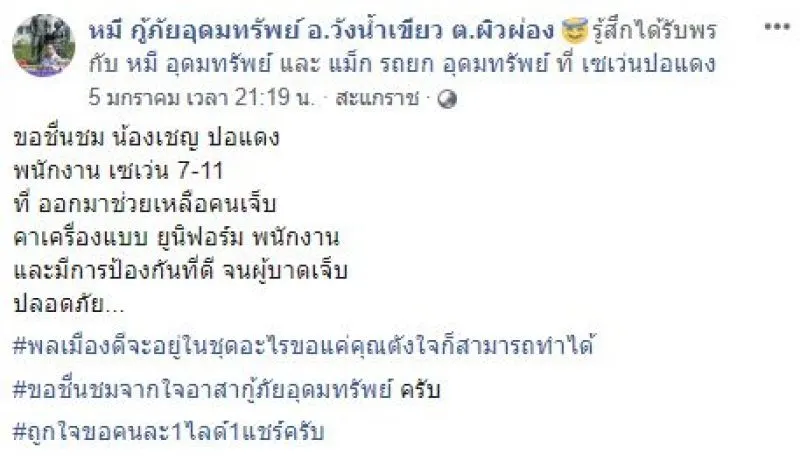 การช่วยเหลือผู้คนสามรถทำได้ทุกที่ ทุกเวลา อยู่ที่ความสะดวกของผู้ที่ต้องการจะช่วยเหลือ เป็นอีกหนึ่งเรื่องราวที่สร้างความประทับใจให้กับผู้คนในโลกโซเชียลเป็นอย่างมาก เมื่อได้มีผู้ใช้เฟซบุ๊กรายหนึ่งได้โพสต์ภาพและข้อความของหนุ่มพนักงานร้านสะดวกซื้อที่ได้เข้าไปช่วยเหลือผู้ที่กำลังประสบเหตุอยู่หน้าร้านพร้อมกับชุดพนักงาน โดยมีข้อความระบุว่า ขอชื่นชม น้องเชญ ปอแดง พนักงานเซเว่น 7 11 ที่ ออกมาช่วยเหลือคนเจ็บ คาเครื่องแบบยูนิฟอร์มพนักงานและมีการป้องกันที่ดี จนผู้บาดเจ็บ ปลอดภัย