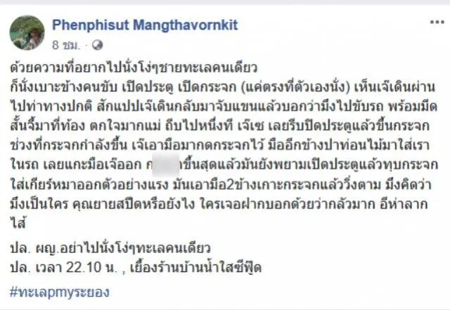 เตือนภัยสำหรับสาวๆหรือใครก็แล้วแต่ที่ชอบนั่งชายทะเลตอนกลางคืนคนเดียว ท่านอาจจะไม่ได้โชคดีเหมือนหญิงสาวรายนี้ก็ได้ เมื่อวันที่ 7 มกราคม ผู้ใช้เฟสบุ๊คชื่อว่า Phenphisut Mangthavornkit ได้โพสต์ข้อความระบุว่า ด้วยความที่อยากไปนั่งโง่ๆชายทะเลคนเดียว ก็นั่งเบาะข้างคนขับ เปิดประตู เปิดกระจก (แค่ตรงที่ตัวเองนั่ง)