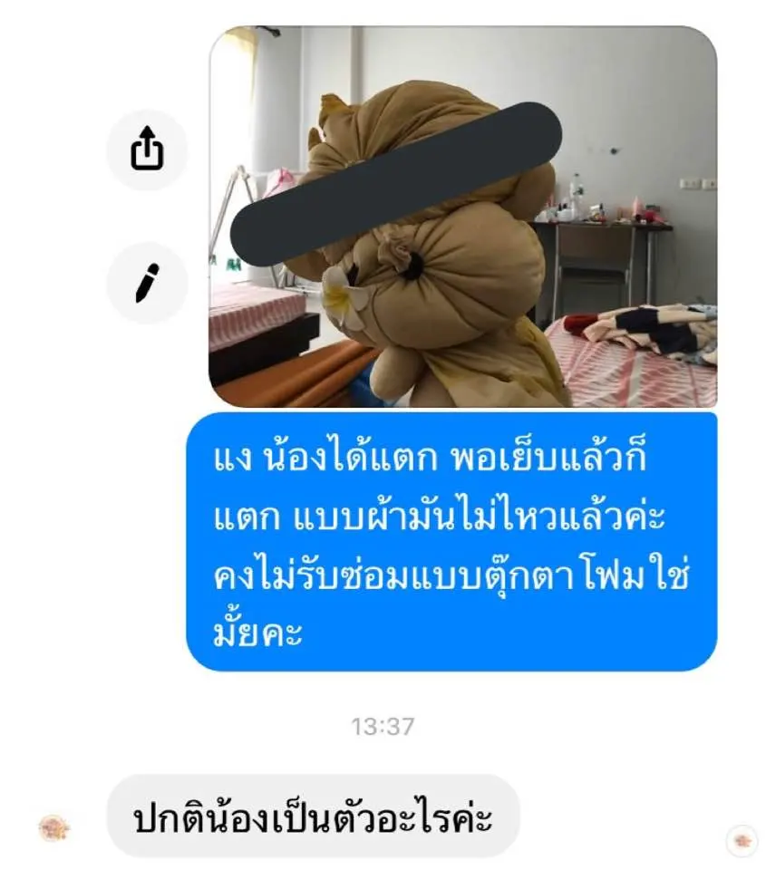 โดยสาวรายนี้ได้ทักไปหาทางร้านพร้อมถามว่า “แง น้องไส้แตก พอเย็บแล้วก็แตก แบบผ้ามันไม่ไหวแล้วค่ะ คงไม่รับซ่อมตุ๊กตาแบบโฟมใช่มั้ยคะ”