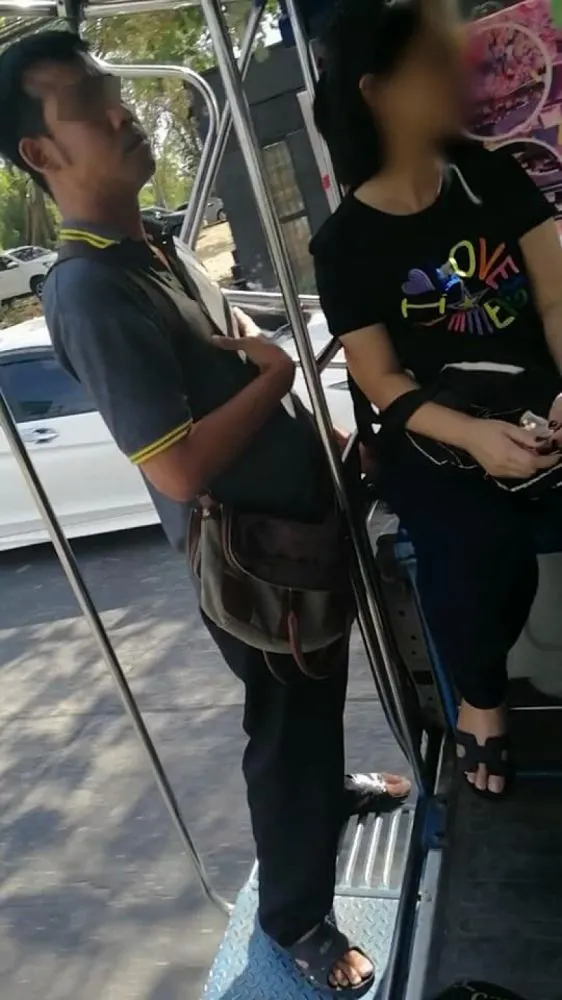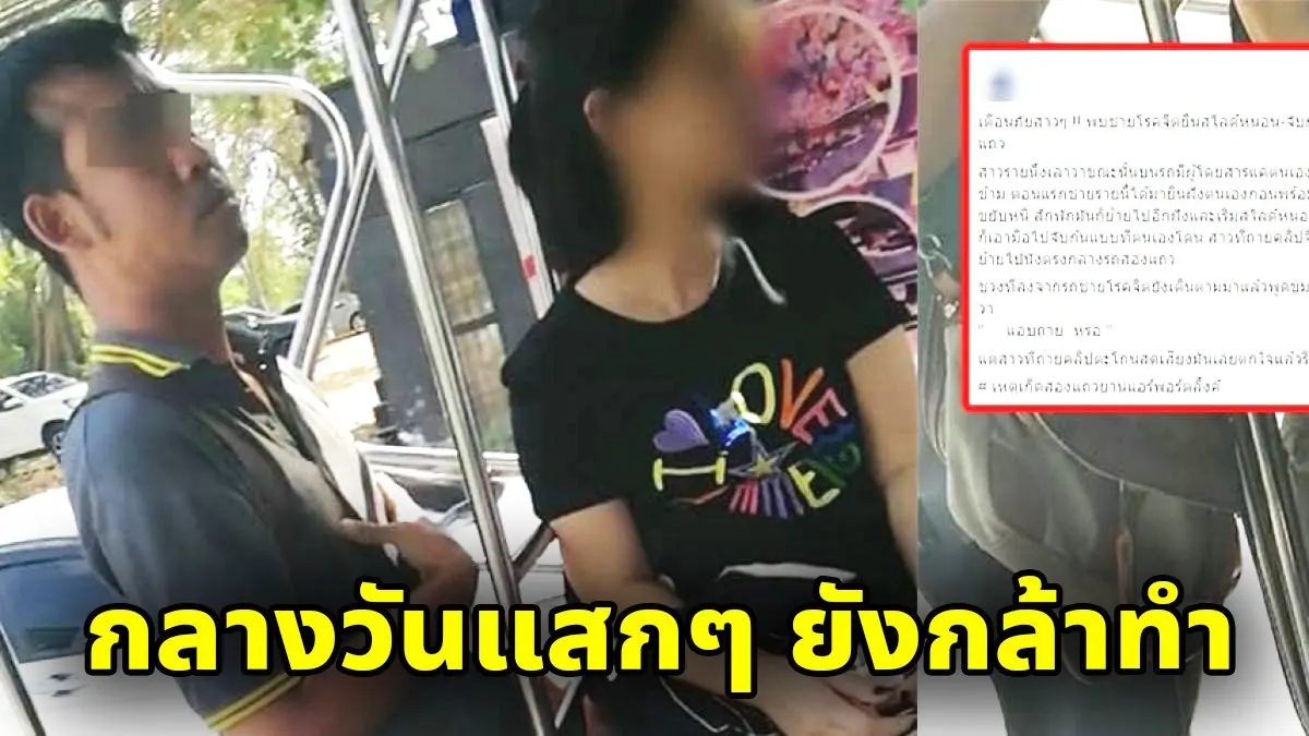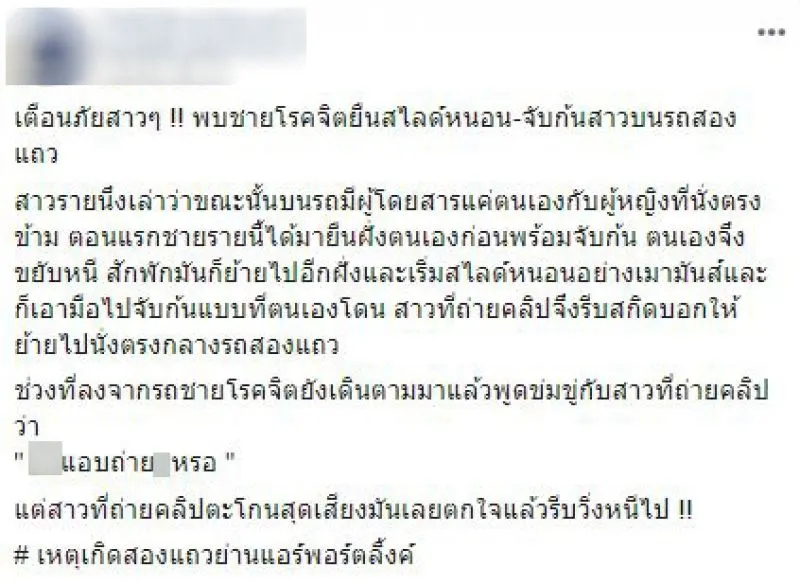 โดยมีข้อความระบุว่า เตือนภัยสาวๆ พบชายโรคจิตยืนสำเร็จความใคร่ ลวมลามสาวบนรถสองแถว สาวรายหนึ่งเล่าว่าขณะนั้นบนรถมีผู้โดยสารแค่ตนเองกับผู้หญิงที่นั่งตรงข้าม ตอนแรกชายรายนี้ได้มายืนฝั่งตนเองก่อนพร้อมจับก้น ตนเองจึงขยับหนี สักพักมันก็ย้ายไปอีกฝั่งและเริ่มสำเร็จความใคร่อย่างเมามันส์และก็เอามือไปจับก้นแบบที่ตนเองโดน สาวที่ถ่ายคลิปจึงรีบสกิดบอกให้ย้ายไปนั่งตรงกลางรถสองแถ ช่วงที่ลงจากรถชายโรคจิตยังเดินตามมาแล้วพูดข่มขู่กับสาวที่ถ่ายคลิปว่า แอบถ่ายหรอ แต่สาวที่ถ่ายคลิปตะโกนสุดเสียง ชายคนดังกล่าวเลยตกใจแล้วรีบวิ่งหนีไป เหตุเกิดสองแถวย่านแอร์พอร์ตลิ้งค์