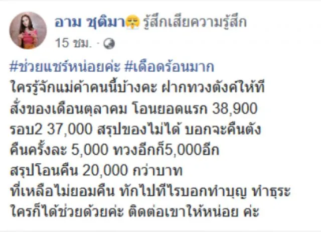 หลายคนคงรู้จักกันเป็นอย่างดีสำหรับนักร้องสาวสวยเสียงดี อย่าง อาม ชุติมา ที่พักนี้เจ้าตัวก็สวยวันสวยคืนจนแฟนต้องหลงรักกันเป็นแถวๆ ล่าสุดเจ้าตัวก็ได้โพสต์ข้อความระบุว่า ช่วยแชร์หน่อยค่ะ เดือดร้อนมาก ใครรู้จักแม่ค้าคนนี้บ้างคะ ฝากทวงตังค์ให้ที สั่งของเดือนตุลาคม โอนยอดแรก 38900 รอบ2 37000 สรุปของไม่ได้ บอกจะคืนตัง คืนครั้งละ 5000 ทวงอีกก็5,000อีก สรุปโอนคืน 20000 กว่าบาท ที่เหลือไม่ยอมคืน ทักไปทีไรบอกทำบุญ ทำธุระ ใครก็ได้ช่วยด้วยค่ะ ติดต่อเขาให้หน่อย ค่ะ