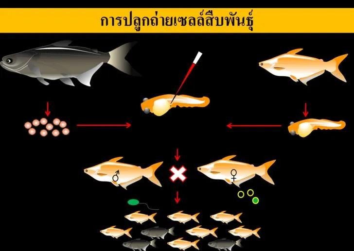 ทีมวิจัยได้ทำการศึกษาวิจัยในกลุ่มปลาบึกและปลาสวายโดยใช้ปลาบึกเป็นปลาผู้ให้ (Donor Fish) และปลาสวายเป็นปลาผู้รับ (Recipient Fish) เนื่องจากปลาบึกเป็นปลาที่พบตามธรรมชาติในลุ่มแม่น้ำโขงและเป็นปลาขนาดใหญ่ที่มีข้อจำกัดในการใช้พื้นที่ในการเพาะเลี้ยงและขยายพันธุ์ และตามธรรมชาติยังมีจำนวนลดลงอย่างต่อเนื่อง ส่วนปลาสวายเป็นปลาที่มีสายวิวัฒนาการใกล้เคียงกับปลาบึก มีการเพาะเลี้ยงกันอย่างแพร่หลาย สามารถเพาะพันธุ์และอนุบาลปลาสวายได้ในบ่อเลี้ยงขนาดเล็ก โดยในขั้นตอนของงานวิจัยจะสกัดเอาเสต็มเซลล์ (Stem Cell) จากอวัยวะสืบพันธุ์ปลาบึก เพื่อมาปลูกถ่ายในลูกปลาสวายเผือกวัยอ่อนอายุ 4-5 วัน แล้วเลี้ยงปลาสวายเผือกที่ได้รับการปลูกถ่ายเซลล์สืบพันธุ์จนเป็น พ่อ-แม่พันธุ์ และนำมาเพาะขยายพันธุ์ตามธรรมชาติในบ่ออนุบาล