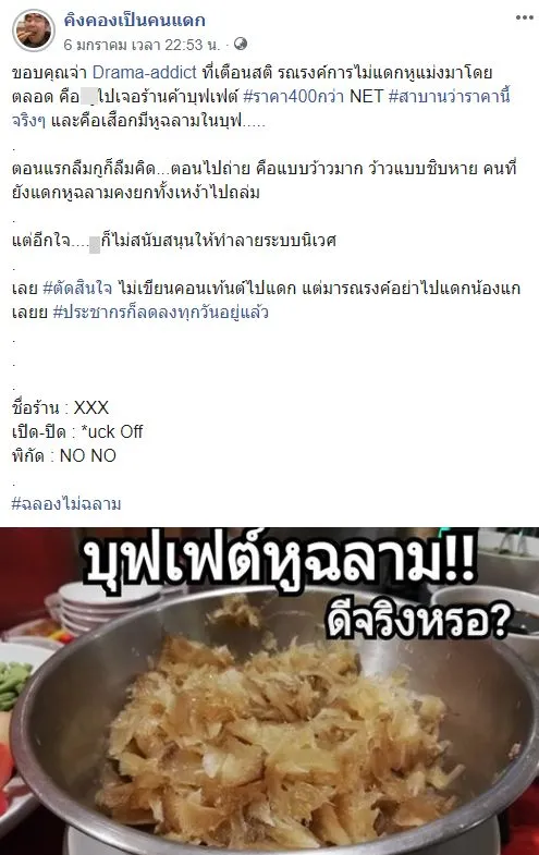 โดยเพจ คิงคองเป็นคนแดก เผยว่า… ขอบคุณจ่า Drama-addict ที่เตือนสติ รณรงค์การไม่แดกหูแม่งมาโดยตลอด คือ กูไปเจอร้านค้าบุฟเฟต์ #ราคา400กว่า NET #สาบานว่าราคานี้จริงๆ และคือเสือกมีหูฉลามในบุฟ….. ตอนแรกลืมกูก็ลืมคิด…ตอนไปถ่าย คือแบบว้าวมาก ว้าวแบบชิบหาย คนที่ยังแดกหูฉลามคงยกทั้งเหง้าไปถล่ม แต่อีกใจ….ก็ไม่สนับสนุนให้ทำลายระบบนิเวศ เลย #ตัดสินใจ ไม่เขียนคอนเท้นต์ไปแดก แต่มารณรงค์อย่าไปแดกน้องแกเลยย #ประชากรก็ลดลงทุกวันอยู่แล้ว ชื่อร้าน : XXX เปิด-ปิด : *uck Off พิกัด : NO NO