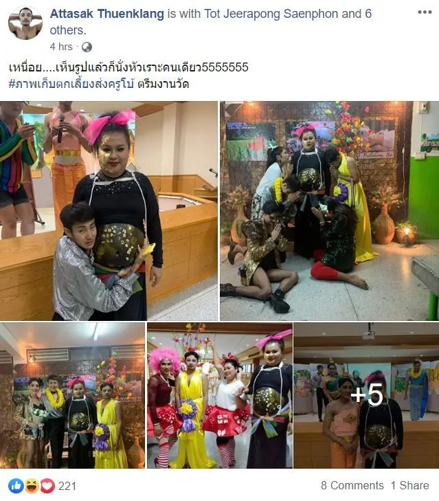โดยทางผู้ใช้เฟซบุ๊ค เขียวฟง แม่นางยังซิงอยู่ สวยอร่อย ได้เผยไอเดียในการเเต่งกายอันสุดล้ำ ในการเข้าร่วมงานเลี้ยงส่งเพื่อนไปบรรจุเป็นคุณครูใหม่ ในธีมงานจัด ซึ่งเเต่ละคนจัดเต็มกันสุดๆ ไม่มีใครยอมใคร พร้อมข้อความธีมงานวัด ขอคะแนนค่ะ