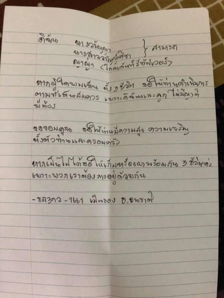 ทั้งนี้ได้กระดาษเขียนจดหมายสั่งลา ระบุข้อความว่า “ดิฉัน นางวรัญญา สามารถ นางสาววรัญญ์ศิชา สามารถ ญาญ่า (โกลเด้น รีทรีฟเวอร์) หากผู้ใดพบเห็นทั้ง 3 ชีวิต ขอให้ท่านดำเนินการตามที่เห็นสมควร เพราะดิฉันและลูกไม่มีญาติพี่น้อง ขอขอบคุณ ขอให้ท่านมีความสุข ความเจริญ ทั้งตัวท่านและครอบครัว หากเป็นไปได้ขอให้เก็บหรือเผาพร้อมกัน 3 ชีวิตค่ะ เพราะพวกเราต้องการอยู่ด้วยกัน