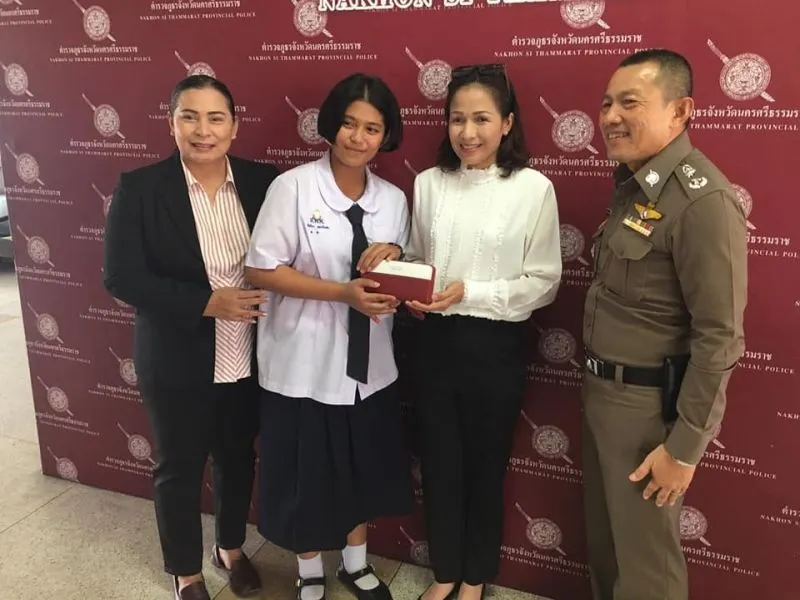 โดย พล ต ต สนธิชัย อาวัฒนกุลเทพ ผู้บังคับการตำรวจภูธรจังหวัดนครศรีธรรมราช พร้อมด้วย นางโปรยฝน อาวัฒนกุลเทพ ภรรยา ได้ส่งมอบกระเป๋าเงิน พร้อม โทรศัพท์ ให้แก่ ด ญ ภัทรียา ทองจินดา นักเรียนชั้น ม 2 โรงเรียนสาธิตวัดเพชรจริก อำเภอเมือง จังหวัดนครศรีธรรมราช บุตรสาวของ นางสาวสุดา รำพึงนิตย์