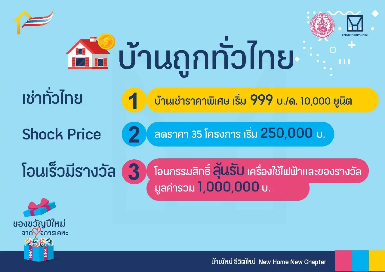 8 มกราคม 2563-นายธัชพล กาญจนกูล ผู้ว่าการการเคหะแห่งชาติ (กคช.) เปิดเผยว่า กคช.ร่วมกับกระทรวงการพัฒนาสังคมและความมั่นคงของมนุษย์ (พม.) มอบของขวัญปีใหม่ 2563 ให้กับประชาชน โดยจัดทำโครงการ ‘เช่าทั่วไทย’ นำบ้านเช่า 10,000 หน่วย มาให้ประชาชนเช่าอยู่อาศัยในอัตราพิเศษ คิดค่าเช่าเริ่มต้น 999 บาท/เดือน ทั้งนี้ กคช.จะเปิดให้ประชาชนจองสิทธิบ้านเช่าผ่านเว็บไซด์ http://999.nha.co.th เริ่มตั้งแต่เวลา 8.30 น.ของวันที่ 9 ม.ค.ถึงวันที่ 30 มิ.ย.2563