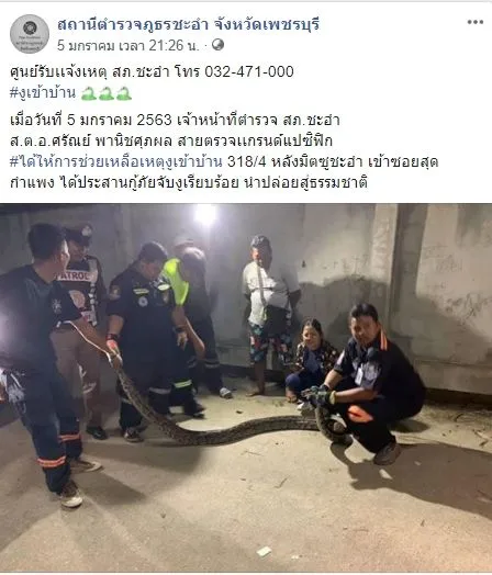 ศูนย์รับเเจ้งเหตุ สภ.ชะอำ โทร 032-471-000 งูเข้าบ้าน เมื่อวันที่ 5 มกราคม 2563 เจ้าหน้าที่ตำรวจ สภ.ชะอำ ส.ต.อ.ศรัณย์ พานิชศุภผล สายตรวจเเกรนด์แปซิฟิกได้ให้การช่วยเหลือเหตุงูเข้าบ้านเลขที่ 318/4 หลังมิตซูชะอำ เข้าซอยสุดกำแพง ได้ประสานกู้ภัยจับงูเรียบร้อย นำปล่อยสู่ธรรมชาติ