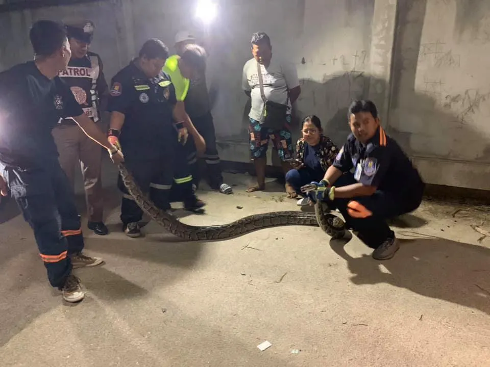 เจ้าหน้าที่ช่วยกันจับงูเหลือมยักษ์เลื้อยเข้าบ้านคน นักเสี่ยงโชคแห่ส่องเลขที่บ้าน