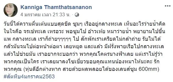 ผู้ใช้เฟซบุ๊กโพสต์ข้อความระบุว่า “วันนี้ได้ความตื่นเต้นแบบสุดขีด ซูมๆ เรืออยู่กลางทะเล เห็นอะไรว่ายน้ำคิดในใจคือ จรเข้ทะเล เหรอวะ พอซูมไป อ้าวเห้ย หมาว่ายน้ำ พยายามไปขึ้นแพ กลางทะเล เราก็ถ่ายๆๆๆๆๆ ไป สักพักเราเครียดไม่กล้าถ่าย รับไม่ได้กลัวมันจมไปต่อหน้าต่อตา เลยหยุด และแล้ว มีฝรั่งพายเรือไปกลางทะเล แล้วไปช่วยมัน เราอยากจะบอกว่า พวกคุณโคตรนางฟ้าเลย แต่เราไม่รู้ว่าพวกคุณเป็นใคร เราเลยมาลงโซเชี่ยวขอบคุณแทนน้องหมาให้นะคะ รักพวกคุณ (หุ่นดีอีกต่างหาก สวยด้วยผลพลอยได้ของเลนส์ซูม 600mm)”