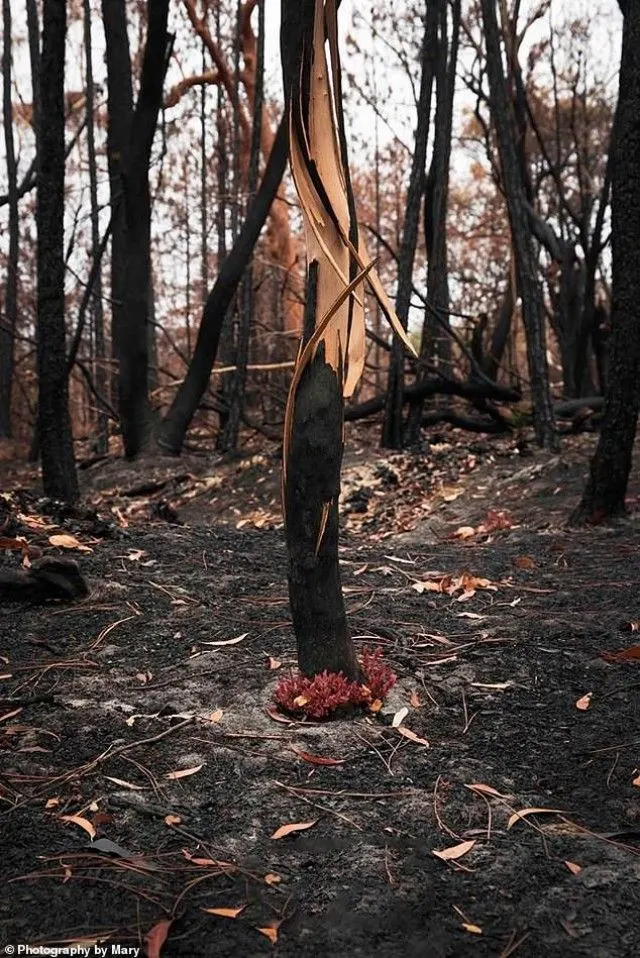 ภาพที่บันทึกโดยช่างภาพท้องถิ่นสองคน และเผยแพร่ในเฟซบุ๊คของ แมรี่ วัวร์วินด์ ที่มีคำบรรยายว่า “น่าขนลุกแต่สวยงาม” ได้แสดงให้เห็นต้นไม้ที่ถูกเผาจนเป็นสีดำเริ่มแตกกิ่งก้านและผลิใบอ่อน ที่มีทั้งสีชมพูและสีเขียวอ่อน อันเป็นสัญลักษณ์แห่งความหวังหลังภัยพิบัติ และความสามารถในการฟื้นตัวอย่างรวดเร็วของธรรมชาติหลังถูกไฟป่าเผาทำลาย ท่ามกลางอากาศที่แห้งแล้ง ชีวิตใหม่เหล่านี้ เกิดขึ้นที่แถมคัลนูร่า ชายฝั่งรัฐนิว เซาท์เวลส์