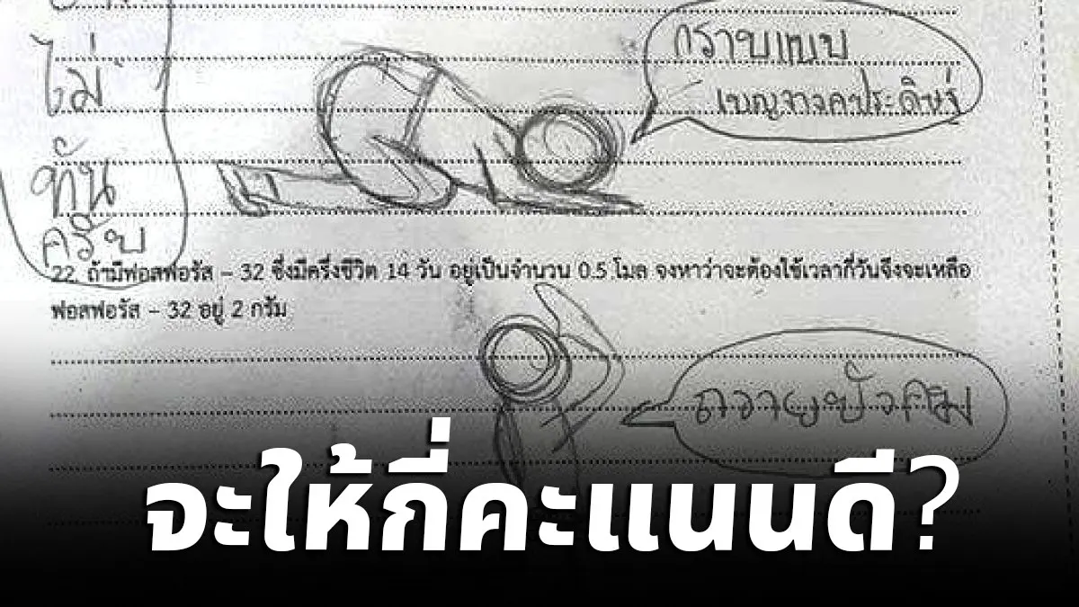 โดยโจทย์คำถาม เป็นลักษณะคำตอบข้อเขียน ให้นักเรียนแก้โจทย์ข้อ 21-23 ซึ่งทางด้านนักเรียนคนดังกล่าวไม่สามารถหาคำตอบที่อาจารย์ตั้งคำถามไว้ได้ ก่อนจะลงมือนำดินสอมาวาดรูปตนเองอยู่ในอากัปกิริยา ก้มกราบแบบเบญจางคประดิษฐ์ ถวายบังคม พร้อมยกมือไหว้ และสารภาพตามตรงกับครูผู้สอนว่า “ทำไม่ได้ครับ”