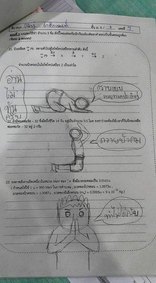 เป็นภาพสุดฮาของเด็กนักเรียนชั้นมัธยมศึกษาปีที่ 6 รายหนึ่ง ที่เจอโจทย์ข้อสอบวิชา ฟิสิกส์ จากครูผู้สอน แต่ดันอ่านหนังสือไม่ทัน ก่อนที่เจ้าตัวจะลงมือวาดรูป พร้อมเขียนข้อความฝากถึงอาจารย์ผู้สอนจนเกิดเป็นความฮาจากชาวเน็ตเป็นอย่างมาก
