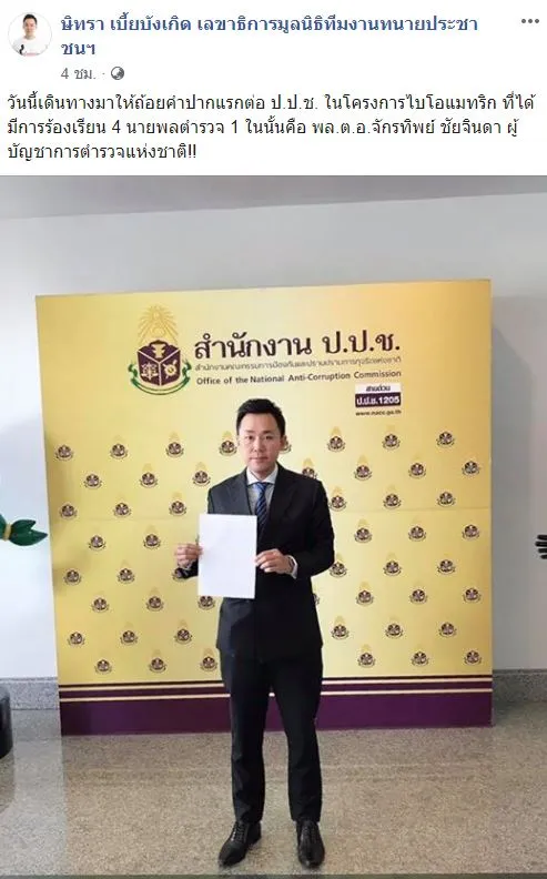 ล่าสุดในเพจเฟซบุ๊กของ ทนายษิทรา เบี้ยบังเกิด หรือ ทนายตั้ม ได้โพสต์เรื่องการติดตามความคืบหน้า การดำเนินการตรวจสอบการทุจริตโครงการจัดซื้อเครื่องไบโอเมทริกซ์ ว่า ” วันนี้เดินทางมาให้ถ้อยคำปากแรกต่อ ป.ป.ช. ในโครงการไบโอเมทริกซ์ ที่ได้มีการร้องเรียน 4 นายพลตำรวจ 1 ในนั้นคือ พล.ต.อ.จักรทิพย์ ชัยจินดา ผู้บัญชาการตำรวจแห่งชาติ!!”