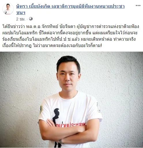 ไม่เท่านั้น ทนายษิทรา ยังระบุผ่านเฟซบุุุ๊กส่วนตัวด้วยว่า ” ได้ยินข่าวว่า พล.ต.อ.จักรทิพย์ ชัยจินดา ผู้บัญชาการตำรวจแห่งชาติ จะฟ้องผมปมไบโอเมทริกซ์ ชีวิตต่อจากนี้คงจะอยู่ยากขึ้น แต่ผมเตรียมใจไว้ก่อนจะร้องเรียนเรื่องไบโอเมทริกซ์ไปที่ป.ป.ช.แล้ว ผมจะเดินหน้าต่อ ทำความจริงเรื่องนี้ให้ปรากฎ ไม่ว่าอนาคตจะต้องเจอกับอะไรก็ตาม!”