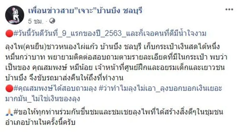 เรียกได้ว่าเป็นอีกหนึ่งเรื่องราวดี ๆ ที่น่าชื่นชมเป็นอย่างมาก วันที่ 9 มกราคม 2563 เพจบุ๊กเพจ เพื่อนข่าวสาย เจาะ บ้านบึง ชลบุรี ได้มีการรายงานว่า วันนี้วันดีวันที่ 9 แรกของปี 2563 และก็เจอคนที่ดีมีน้ำใจงาม