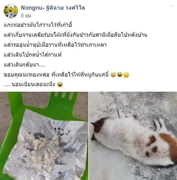 ผู้ใช้เฟซบุ๊กโพสต์ข้อความระบุว่า “แกะห่อข้าวมันไก่วางไว้ที่เก้าอี้ แล้วเก็บจานเคลียร์บนโต๊ะที่นั่งกินข้าวกับสามีเมื่อคืนไปหลังบ้าน แล้วรออุ่นน้ำซุปเมื่อวานที่เหลือไว้ทำเกาเหลา แล้วเดินไปกดน้ำใส่กาแฟ แล้วเดินกลับมา…. ขอบคุณนะทองหล่อ ที่เหลือไว้ให้พี่หนูกินแค่นี้ …. นอนเนียนเลยนะมึx”