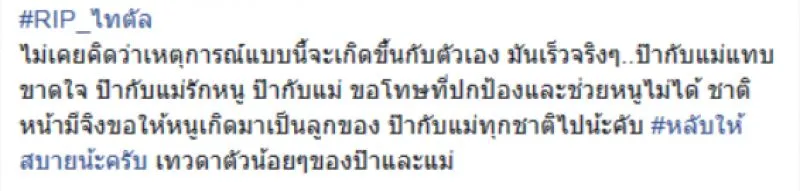ล่าสุด คุณพ่อของหนูน้อยวัย 2 ขวบ ได้โพสต์ลงเฟซบุ๊ก โดยได้ระบุข้อความสุดเศร้าว่า RIP ไทตัล ไม่เคยคิดว่าเหตุการณ์แบบนี้จะเกิดขึ้นกับตัวเอง มันเร็วจริงๆ ป๊ากับแม่แทบขาดใจ ป๊ากับแม่รักหนู ป๊ากับแม่ ขอโทษที่ปกป้องและช่วยหนูไม่ได้ ชาติหน้ามีจิงขอให้หนูเกิดมาเป็นลูกของ ป๊ากับแม่ทุกชาติไปน้ะคับ หลับให้สบายน้ะครับ เทวดาตัวน้อยๆของป๊าและแม่
